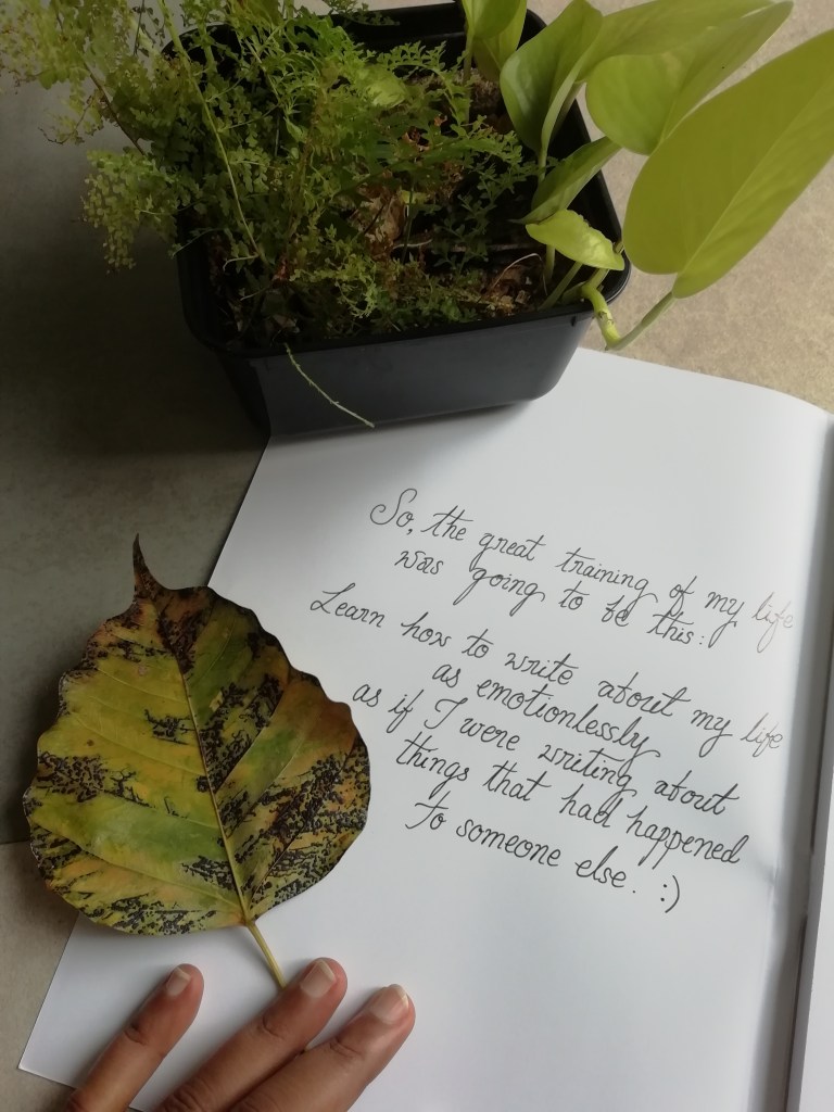 I had to learn this the hard way, of course. Trying to write out a memoir, or a personal essay, or a non-fiction piece, I would always find it difficult to proceed after a certain point. I would find myself getting stuck in the narrative. Because, contrary to what Hemingway said, bleeding out your truth is not easy. The trauma, the memories, your mind’s stored version of events, takes over. Objective distancing and passive observation are all excellent in theory, gruelling in practice. Often, I catch myself becoming caught up in the emotions triggered by memories of events while I try to write them out. Attempting to write non-fiction, you are also filled with self-doubt: what is ‘truth’, anyway? If human memories are unreliable, and there are multiple truths and realities— why even try to write one’s narrative of events? And the looming, more existential question: who would my version of truth or my ‘story’ matter to, anyway?