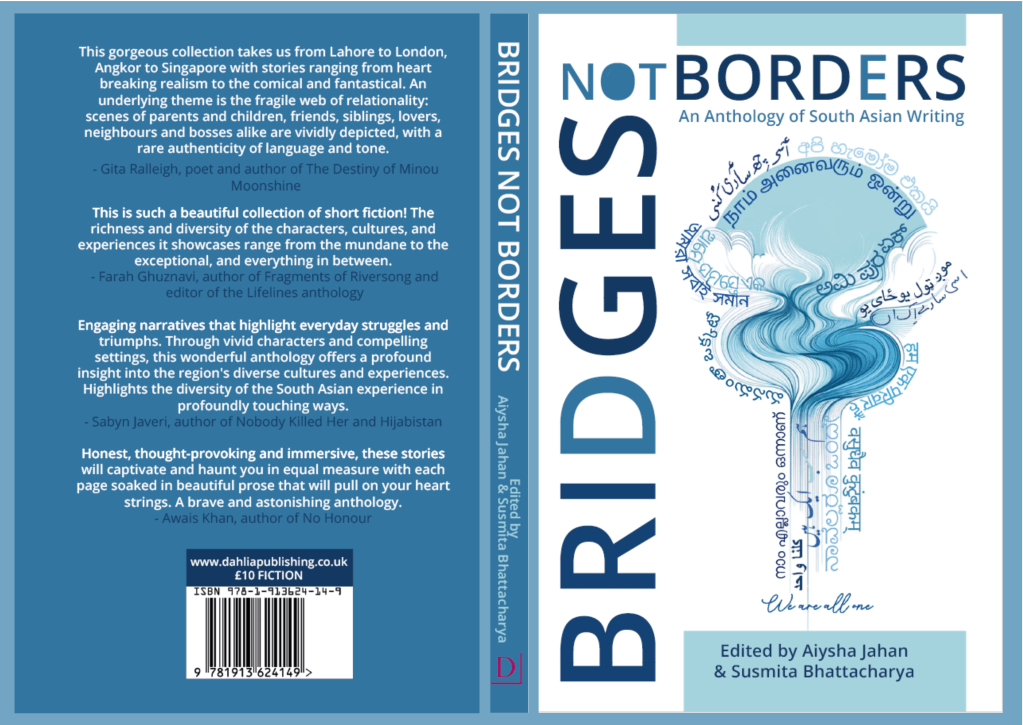 We are so proud to introduce Bridges not Borders: An Anthology of South Asian Writing. Through funding from the ACE and AHRC grants, we have been able to produce our very first anthology of writing by South Asian writers anywhere in the world. The stories in this anthology were sourced from an open call to respond to the theme ‘bridges not borders’. We received and read over a hundred stories from across the globe. We were struck by the range of voices, places and narratives that we received for the anthology, and the fifteen stories in this anthology represent this breadth. Bridges not Borders seeks to celebrate that which unites us, rather than that which divides. The stories explore the ways in which we live, love and co-exist across the world. They surprise, delight and make us reflect on the many things that bring us together, regardless of our background.